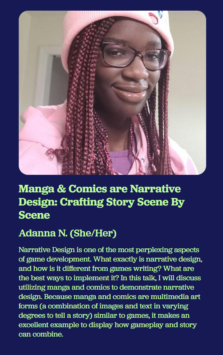 Hello! My name is Adanna, and I am a Games Writer, Narrative Designer, Researcher, and Developer. I have experience in writing, scripting, designing, sensitivity reading, and implementing narrative content for games. In addition, I have also